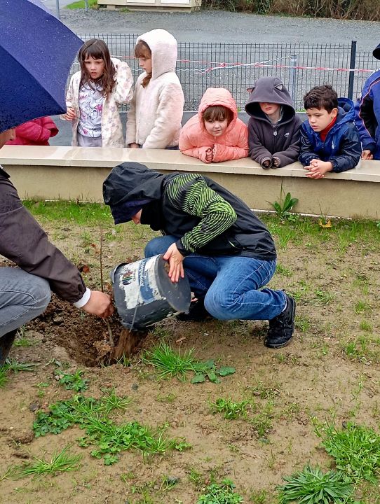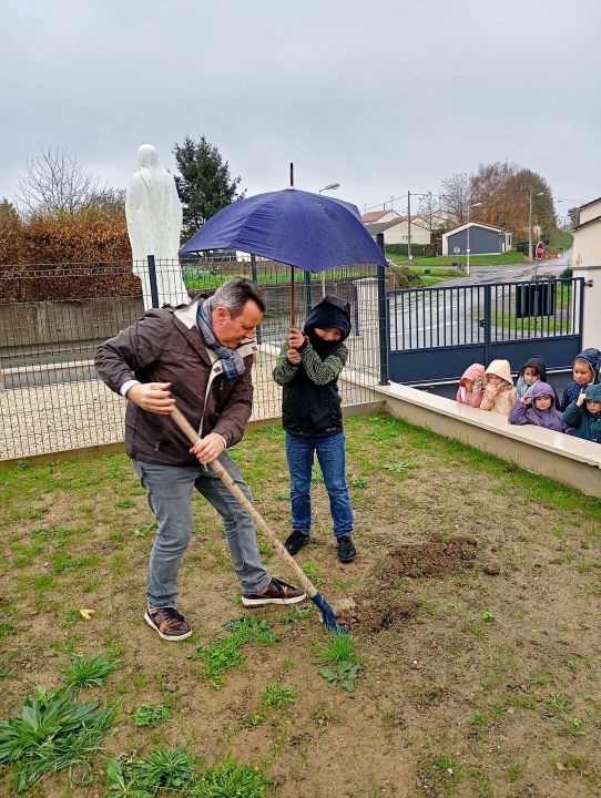 En juin dernier, Flavien, un élève de CM2 maintenant en 6eme, est venu voir l'équipe enseignante expliquant qu'il avait fait pousser chez lui un chêne et qu'il aimerait bien en faire don à la nouvelle école pour le faire grandir. C'était sa manière à lui de participer.